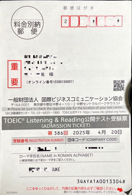 計画のスタートライン確認のために受けるTOEICの受験票が届いた。